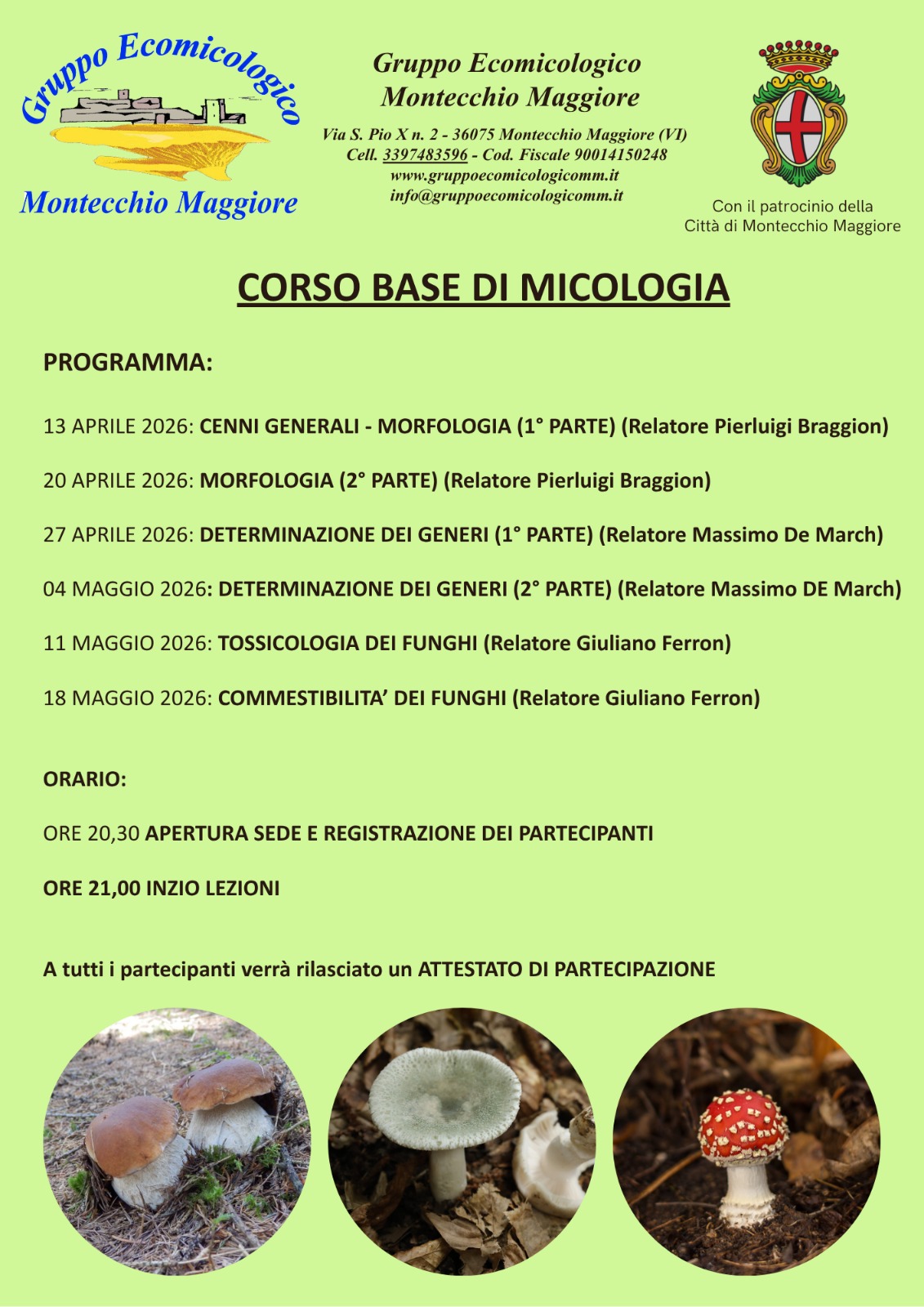 Sede corso: sala civica " corte delle filande" a Montecchio Maggiore vedi locandina di lato   1° incontro: venerdì 6 aprile 2018 ore 20.30 2° incontro :  venerdì 13 aprile 2018 ore 20.30 3° incontro :  venerdì 20 aprile 2018 ore 20.30  Costo totale 10€ iscrizione obligatoria  presso la sede del gruppo OGNI LUNEDì SERA DALLE 20.30 ALLE 22.30 opp.a mezzo bonifico sul c/c del gruppo ecomicologico cod.IBAM :IT 82 B 08399 60531 0000 0010 4765 per informazioni  e-mail : info@gruppoecomicologicomm.it    cell. 345 2440197 --- 339 7483596  ore pasti
